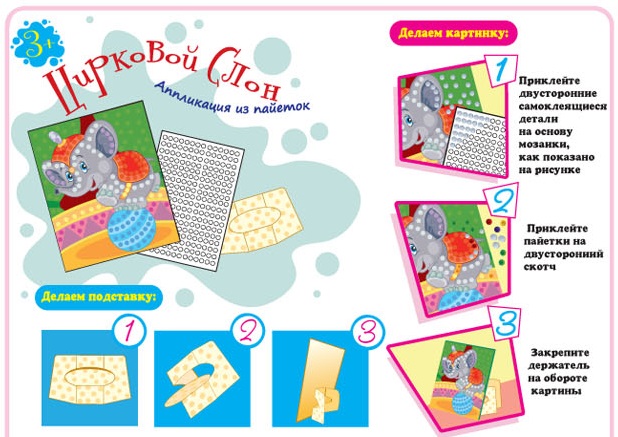 Состав: картонная основа с рисунком, двухсторонние самоклеящиеся детали, пайетки 7 цветов, картонная подставка. Производитель РОССИЯ Размер товара: 20.5 x 0.3 x 16.7 см. Размер упаковки: 17 x 1 x 35 см. Вес: 0.049 кг