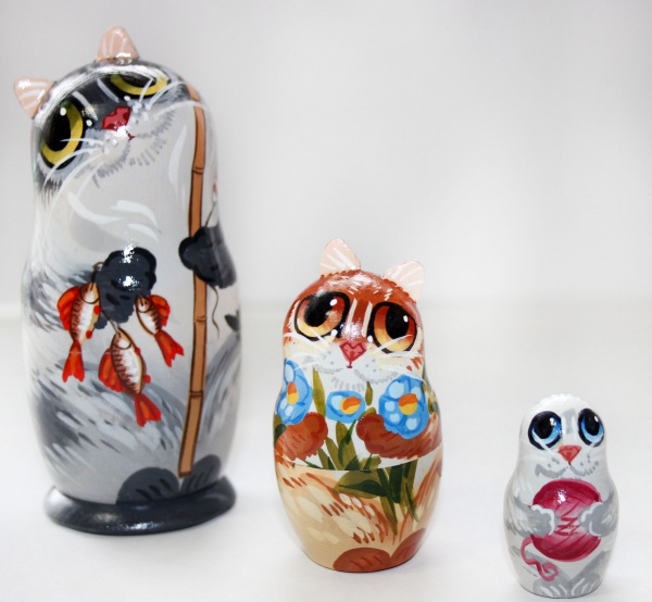 Матрешки – древние народные игрушки, которые пользуются популярностью и по сей день. Они уникальны по своей природе, а потому высоко ценятся не только в России, но и в зарубежье. В данной коллекции представлены фигурки кошек – милых, забавных и неповторимых! Каждая Матрешка авторская 3 в 1 "Кошка" представляет собой трио из трех очаровательнейших представителей семейства кошачьих, живописные образы которых украшают каждую из фигур матрешки. Наша Матрешка авторская 3 в 1 "Кошка" уникальна и самобытна, она имеет особенное художественное формление и порадует всех тех, кто любит кошек, будь то взрослый или ребенок, заграничных друзей и коллег, а также всех, кто любит и ценит качество и красоту русского сувенира под названием "Матрешка"!