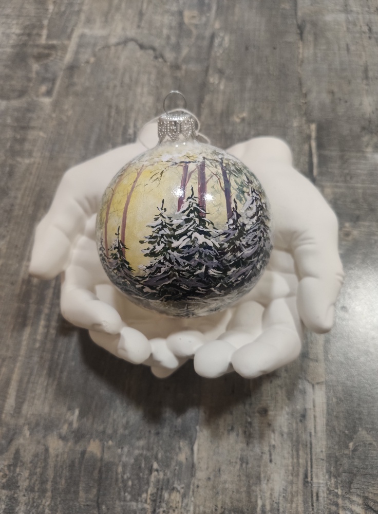 Диаметр 8 см, стекло, авторская ручная роспись темперными красками, шар покрыт глянцевым лаком.