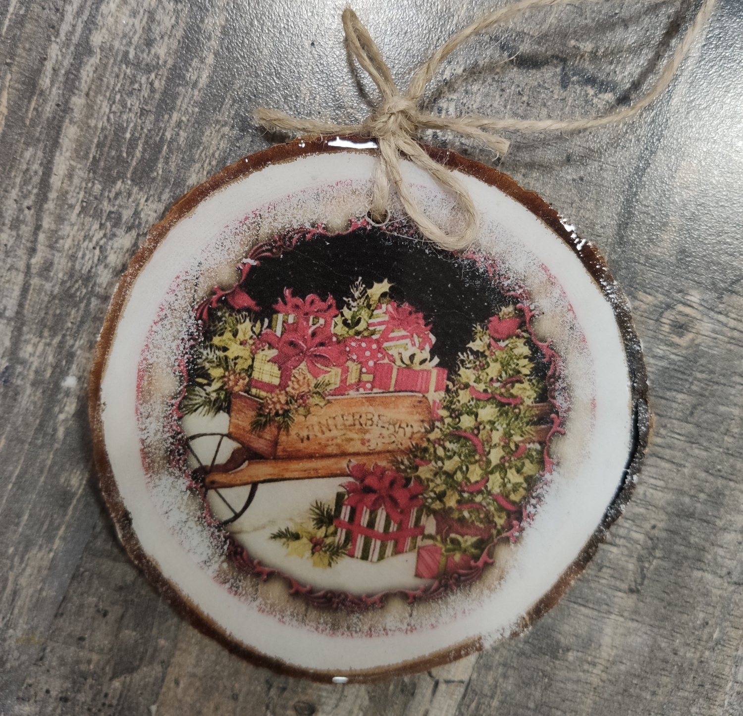 Новогоднее украшение с использованием спила дерева (ясеня), декупажной карты на рисовой бумаге в «ретро» стиле, декорирован темперными красками и покрытием эпоксидной смолы.