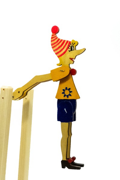 Эта классическая игрушка в виде гимнаста, который может выполнить «солнышко» на турнике, оформлена, как герой знаменитого советского мультфильма «Буратино».