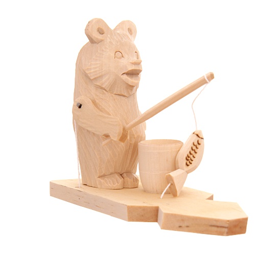 Мишка Рыболов – детище исконных русских ремесел по дереву. Игрушка создана в фолк-стиле с использованием резцов. Чистая древесина оставлена без покраски, подчеркивая единение сюжета с природой. На постаменте, напоминающем рыбацкий мостик, пристроился счастливый Мишка Рыболов, раскрывший рот от удивления. На его крючок попалась большая удача – рыбка, возможно, золотая. Осталось только спрятать её в рядом стоящее ведёрко или загадать желание. Статуэтка имеет подвижные части: лапы медведя могут поднимать и опускать удочку, рыбка висит на верёвке, как на леске.