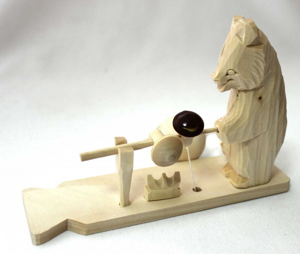 Очень забавная игрушка. Без сомнения, все любят шашлычок. И не только из мяса и рыбы, очень аппетитный шашлык бывает из овощей и даже грибов! Вот и наш Михаил Потапович не прочь отведать лесного угощения! Разложив костёр и насадив на вертел из сосновой ветки белые грибочки, медведь готовит себе аппетитное кушанье. Давайте поможем нашему лесному повару приготовить вкусное блюдо и проследим, чтобы ничего не подгорело! Для этого покрутим основание игрушки, тем самым заставляя шарик-груз смещать центр тяжести и приводить в движение вертел с грибным шашлычком. Пожелаем Михаилу Потаповичу приятного аппетита! Игрушка выполнена народными мастерами из натуральной древесины мягких пород (липа/ольха/осина).
