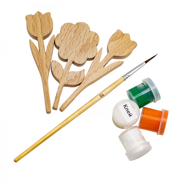 Состав: 3 деревянных цветочка из дерева (бук) с магнитом, кисть, акриловые краски (белый, зеленый, оранжевый)+клей