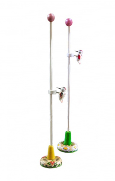 Веселый расписной дятел, стуча по деревянному стержню, спускается вниз. Как будто ищет пищу в стволе дерева.