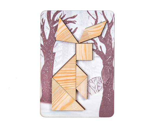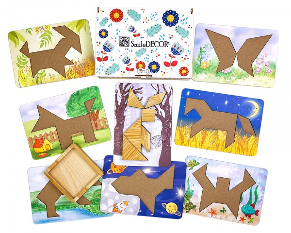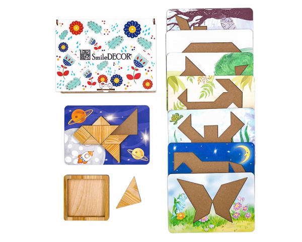 В наборе: 8 шт. деревянных карточек (головоломок) со сверхпрочным УФ нанесением, 1 шт головоломка Танграм из массива дерева