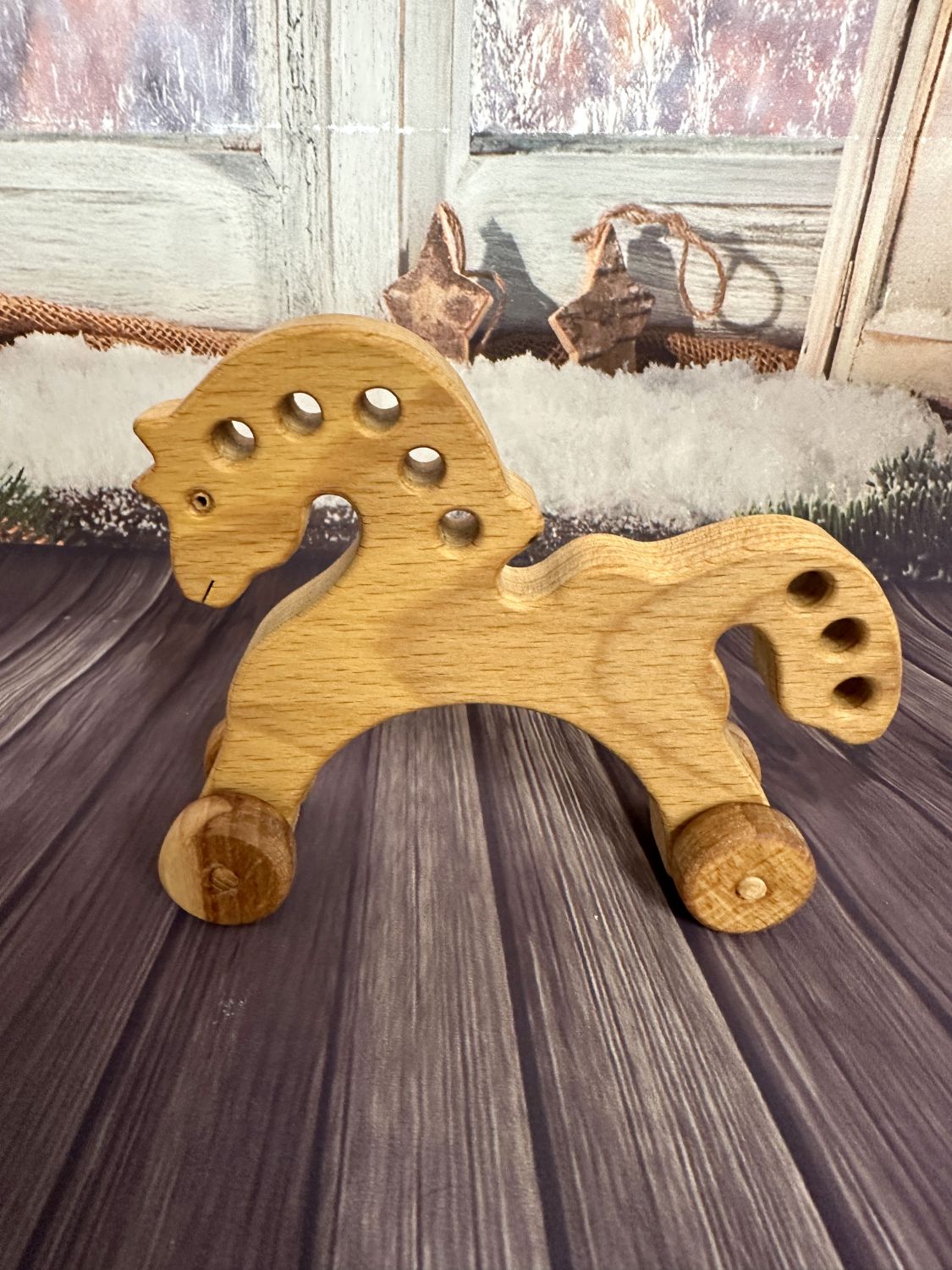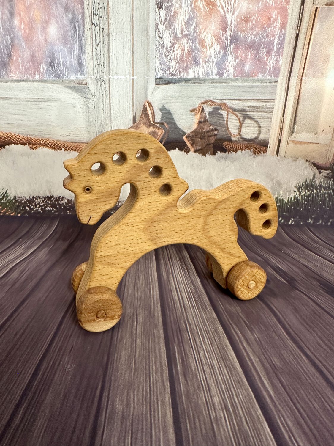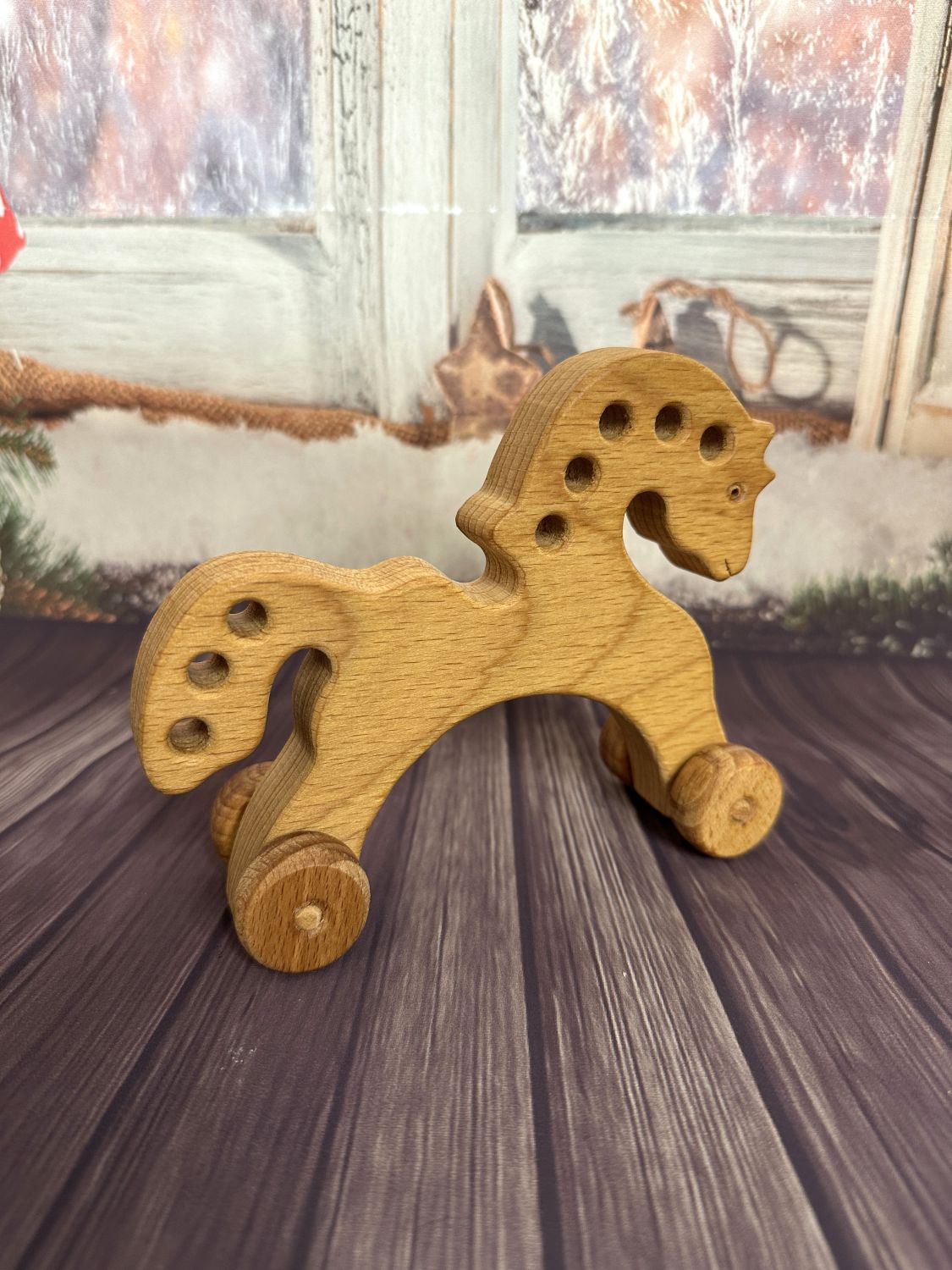 Милая лошадка на колесиках всегда готова поиграть! Она может поднять настроение малышу, развеселить и занять его игрой. С Лошадкой можно устроить скачки и гонки, соревнуясь с другими игрушками-каталками или машинками. Лошадка-каталка достаточно устойчива для того, чтобы катать ее за собой на веревочке. Спинка лошадки выточена под детскую ладошку, поэтому катать удобно и просто рукой. Деревянные игрушки каталки этой серии выполнены из качественной древесины бука и покрыты льняным маслом. Дарите ребенку лучшее, выбирая действительно качественные и полностью экологичные игрушки!