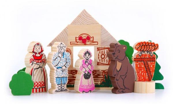 В конструктор входит 17 деталей, сделанных из дерева. Пять деталей - это фигуры героев сказки: дед, бабка, 2 внучки Машеньки (одна с корзинкой, вторая в коробе, а на голове держит пирожки) и Медведь. Другие детали - детали красочного домика, деревья и даже пенек, на который хотел сесть Медведь и съесть пирожок. Короб крепится к спине Медведя при помощи липучек.