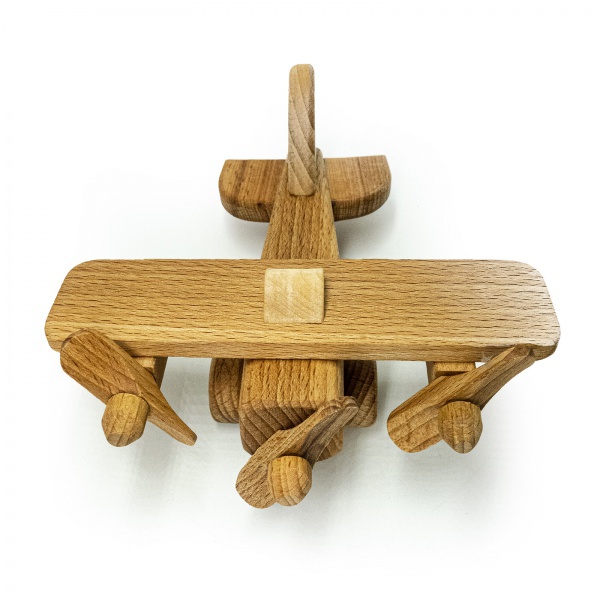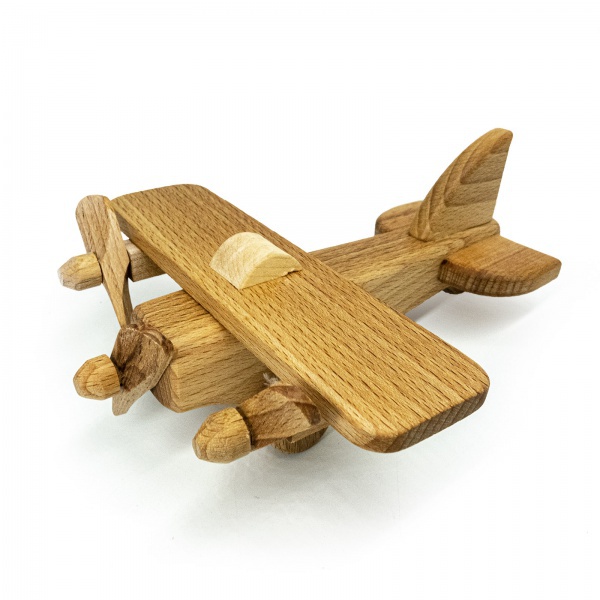 Детский самолётик-моделька изготовлен из плотной буковой древесины. Он склеен вручную из гладко выточенных деталей, часть из которых наделена вращательной динамикой, в частности, шасси и винтовые лопасти. Привести их в движение можно, соответственно, катая по полу или толкнув пальцем. Фактура некрашеного дерева придаёт игрушке трогательный внешний вид и приятные ощущения при соприкосновении. Безопасно для маленьких пилотов 2-5 лет.