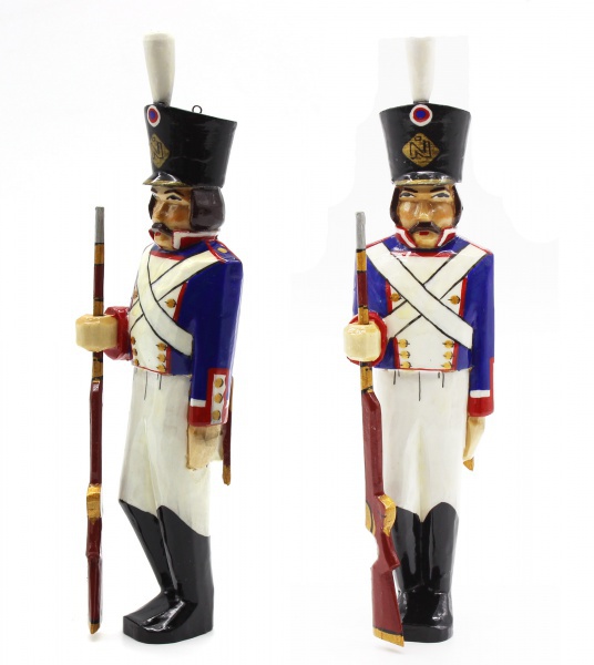 В свое время французская армия покорила почти всю Европу и огромную роль в этом сыграли именно пехотинцы. Всмотритесь в эту фигурку из дерева – насколько точно мастеру удалось передать не только особенность обмундирования, но и характер бойца! Фигурка оснащена специальной петелькой, что позволяет использовать солдатика в качестве подвески, также фигурка может свободно стоять на ровной поверхности.