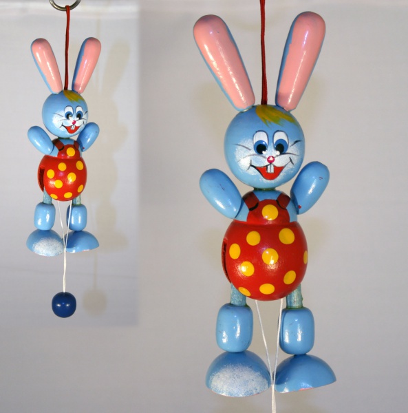 Яркий веселый голубой зайчонок в красном комбинезоне с желтыми горошками задергает ручками и ножками стоит лишь дернуть за ниточку. Подобные деревянные игрушки рекомендованы малышам. С их помощью ребенок начинает осознавать причинно-следственные связи, развивает координацию движений.