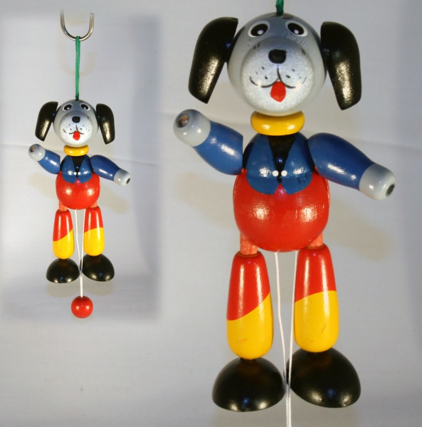 Забавная собачка в яркой одёжке не оставит равнодушным ни ребёнка, ни взрослого. Игрушка поднимет настроение, развлечёт и подарит огромное количество искренних улыбок. Ручки и ступни собачки зафиксированы резинками и при желании их можно покрутить. Ножки связаны с шариком верёвочками, поэтому если дёрнуть за шарик ножки подпрыгнут вверх. Игрушка не только забавляет и приносит много радости, но и помогает развить внимание и мышление детей. Ведь интересно же, как действует дергунчик. Собачку можно подвесить за петельку, которая прикреплена к голове.