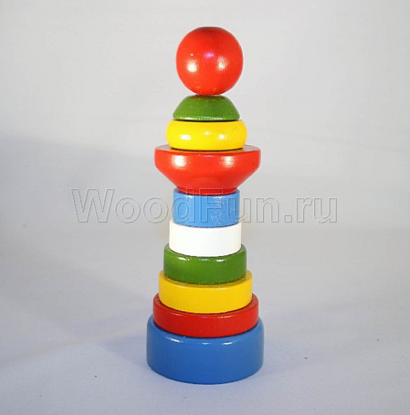 Пирамидки – веселые забавы для малыша. Эти игрушки уже много лет не теряют своей актуальности и привлекают малышню разных возрастов. Пирамида Маяк состоит из 10 деревянных деталей разной формы, цветов и размеров, а также стержня, основания и заглушки в виде шарика. Пирамида из дерева эффективно тренирует у малышей координацию движений и развивает мелкую моторику рук, внимание, интеллект. Благодаря разной расцветке деталей можно знакомить кроху с разными цветами, очень быстро он легко будет различать основные цвета – синий, красный, зеленый. Пирамида Маяк – первый конструктор для Вашего малыша!