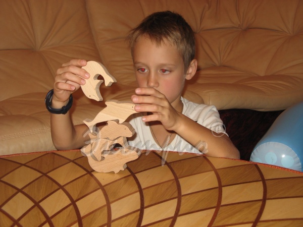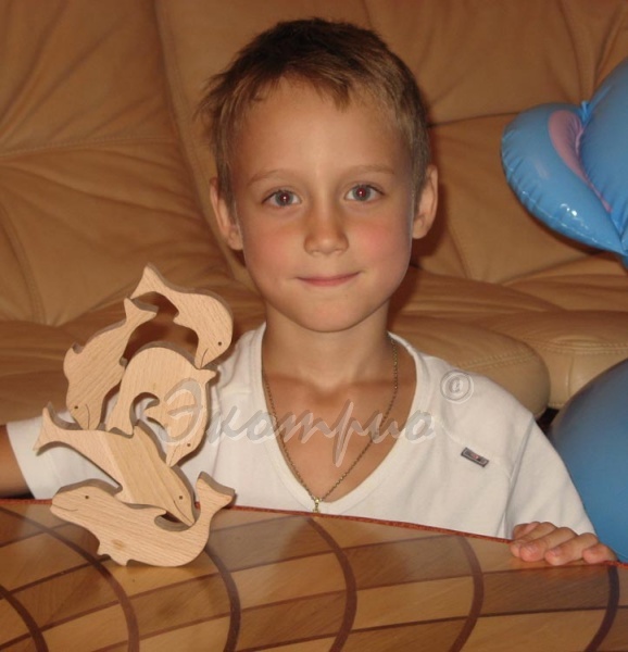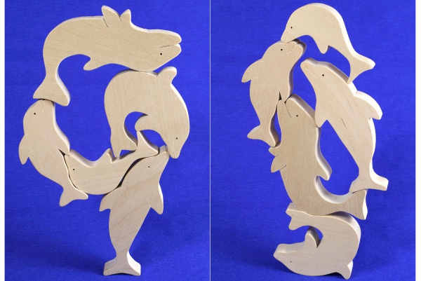 Представляет собой набор из пяти фигурок дельфинов, которые очень тщательно сбалансированы. Из фигурок можно построить великое множество форм пирамид, которые по сути своей представляют игры дельфинов. Некоторые схемы построения таких пирамид мы Вам демонстрируем. Игрушка практически не имеющая недостатков. Уникальная в своей простоте и разнообразии. Наряду с развитием воображения ребенка, развивает чувство координации и равновесия. Ребенку всегда можно предложить новый вариант формы пирамиды, и наконец ребенок может играть в полноценную игру каждой отдельной фигуркой дельфина.