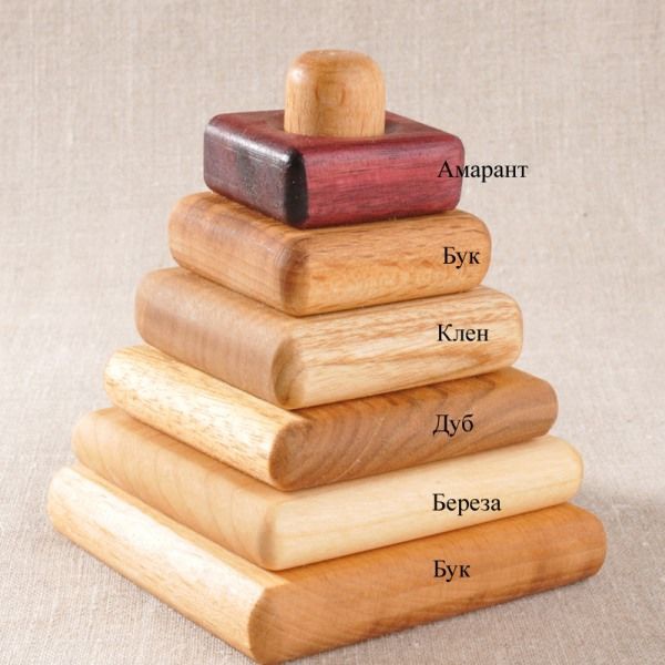 Необычная пирамидка с квадратными деталями познакомит ребенка с разными видами древесины. Играя с этой пирамидкой, малыш узнает, что древесина амаранта обладает красивым бордовым оттенком, березы - самая светлая, почти белая, а древесина клена имеет красивые переливы, бук и дуб- светло коричневые с интересным оттенки. Пирамидка квадратики "6 пород дерева"- отличная развивающая игрушка, которая поможет выучить названия деревьев и понять, насколько сильно отличается их древесина. Собирать деревянную пирамидку намного увлекательней, чем привычную круглую! Детали можно поворачивать вокруг оси под любым углом.