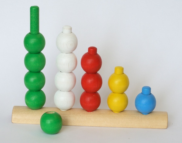 На небольшом деревянном бруске закреплены пять штырей разной длины, окрашенные в желтый, синий, белый, красный и зеленый цвета. На каждый из них надеваются шарики соответствующего цвета. Такие деревянные игрушки помогают ребенку быстрее развиваться, координировать свои движения и овладевать нехитрыми жизненными навыками.