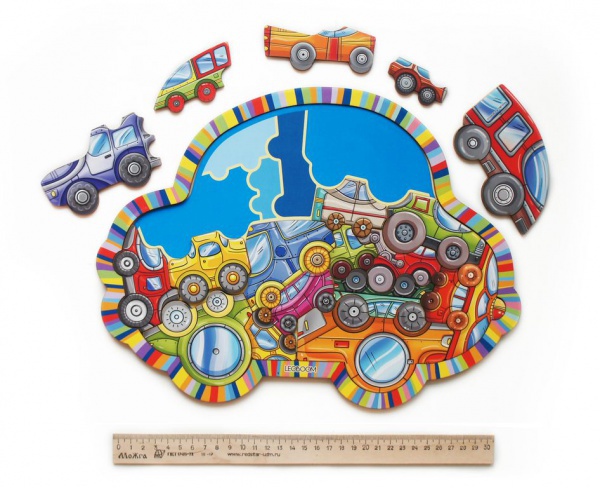 Конструктор-паззл, состоящий из фигурок различных машинок и деревянной подложки, станет прекрасным развлечением для вашего ребенка или смешным подарком для друга!
