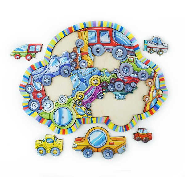 Паззл – прекрасная обучающая и развивающая игрушка, тренирующая воображение, фантазию и память вашего ребенка. Для того, чтобы собрать головоломку, различные машинки, из которых он состоит, необходимо в правильном порядке установить на деревянную подложку, также выполненную в виде машинки.