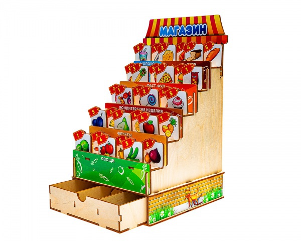 1. Игра «Мой магазин». Вместе с ребенком соберите полки, рассмотрите вывески для разных отделов, назовите, какие продукты продаются в магазине. Объясните, что такое касса, ценник, зачем нужны деньги. Спросите, как называется магазин, в котором продаются продукты? Обсудите, какие еще бывают магазины.