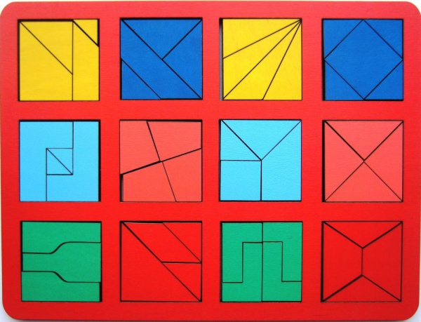 Удобно, что детали квадратов по форме и цвету можно легко разделить на группы. Головоломка развивает математические способности и мелкую моторику рук.