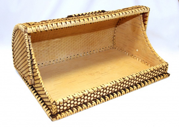 Берестяная хлебница – незаменимая вещь на кухне, благодаря своей изысканности и полезности. При правильном и довольно легком уходе хлебушек в ней не плесневеет, не заветривается и долго остается мягким. Наша хлебница из бересты ручной работы имеет классическую полуовальную форму, она очень удобна и вместительна. Сейчас, когда существует множество приспособлений для хранения хлеба, хорошие хозяйки все же предпочитают деревянные хлебницы. А лучше деревянной хлебницы – только хлебница берестяная. Она менее сильно впитывает запахи, благодаря чему и служит гораздо дольше. Кора березы обладает замечательными антисептическими свойствами. Поэтому, изделия из бересты прекрасно подходят для хранения пищевых продуктов, в частности, хлеба.
