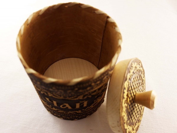 Берестяной туесок — чай средний с плотной крышкой создан в духе старых русских традиций руками народных умельцев. Гибкий материал, шитьё соломкой, нежная текстура поверхности, тонкий тиснёный орнамент, чистый древесный цвет – стилистика, проверенная временем. В комплект ищите на Вудфан берестяную сахарницу.