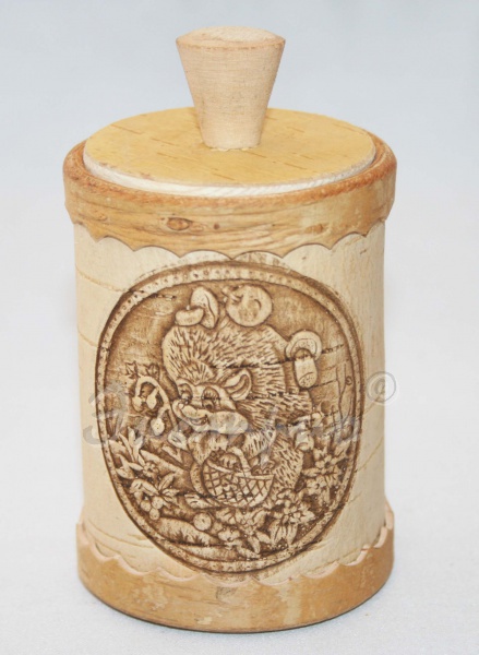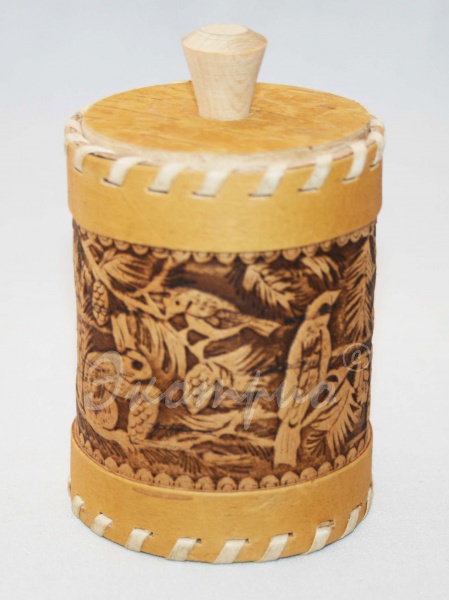 Туесок украшен оригинальным и интересным рисунком, который выжжен на бересте. Хотите удивить друзей необычным подарком? Туесок поможет вам в этом.