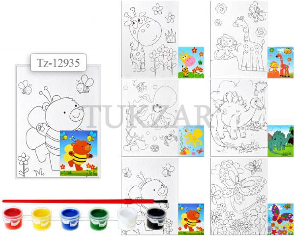 Холст для рисования с нанесенным рисунком, 13х18см., кисточка и краски в комплекте, 6 видов в ассортименте