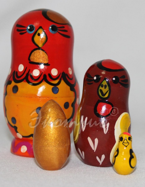 Сложно объяснить малышу, как появляются на свет цыплятки? В этом Вам поможет наша милая матрешечка. Покажите ребенку эту миниатюрную матрешку в виде курочки. Входящие в нее фигуры: курочка- наседка, курочка- молодка, яйцо и цыпленок помогут наглядно разобраться в том, что цыпленочек до поры до времени живет в яйце, которое курочка-наседка греет своим теплом до тех пор, пока малыш окрепнет и сможет самостоятельно проклюнуть твердую скорлупу. На свет появляется пушистый желтенький комочек, затем он крепнет, оперяется и вырастает похожим на свою маму-курочку.