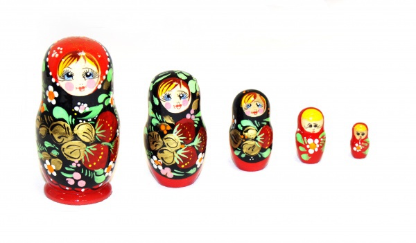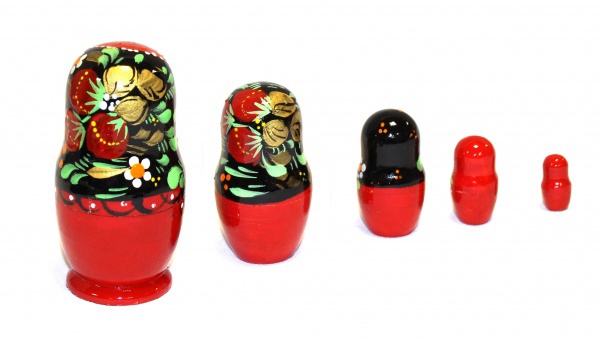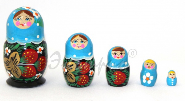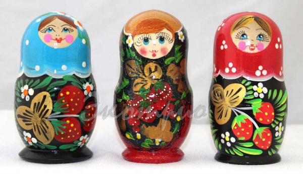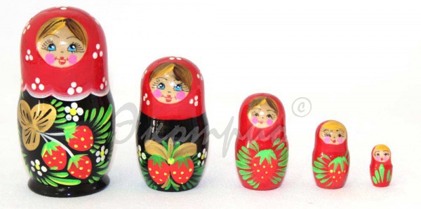 Самая большая из этих матрешек высотой всего 10 см, а остальные сестренки – мал мала меньше. Все они расписаны в стиле хохломской росписи – на сарафанчиках красуются ягоды земляники. Такую коллекцию можно выбрать и на сувенир, и ребенку в подарок. В век планшетов и электроники традиционные игрушки приобретают особенную ценность. Когда из одной матрешки одна за другой появляются еще четыре красавицы — это, в каком-то смысле, волшебство. И ребенок может делать это сам, своими руками, а не только двигая компьютерной мышкой.