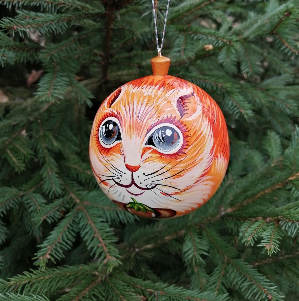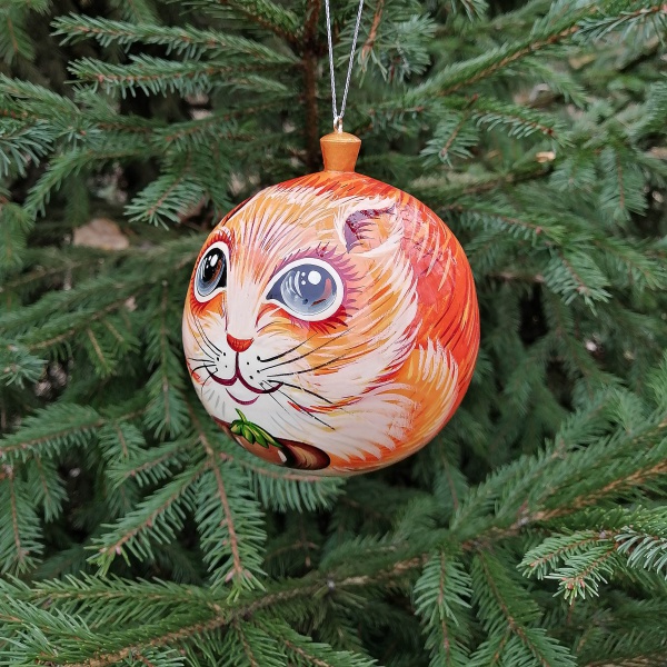 Шар имеет 70 миллиметров в диаметре. Белка нарисована с филигранной точностью, а после рисунок покрыт лаком для прочности, долговечности и яркого блеска.