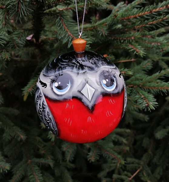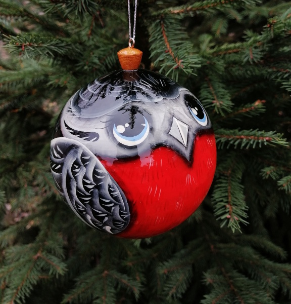 Шар на елку «Снегирь» — отличный подарок для всех, у кого в приоритете натуральность и экологичность. Игрушка изготовлена из дерева, раскрашена вручную и покрыта лаком для еще большего блеска. Диаметр шара — 10 см, поэтому им хорошо украшать большие елки. Красногрудый снегирь с добрыми глазами — одна из игрушек новогодней коллекции на ВудФан.