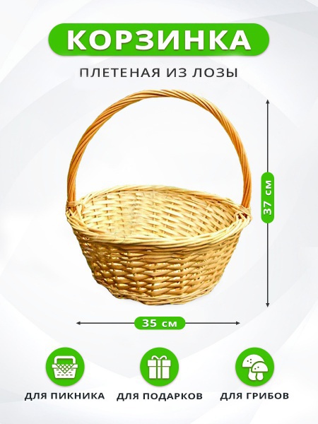 Кроме прочего корзинка ручной работы пригодится на прогулке за ягодами или гербарием. Изделие полностью натуральное и экологичное. Украсит интерьер в стиле Прованс, Кантри, Селянский и других. Для полноты впечатления можно купить корзинку из лозы 25 см.