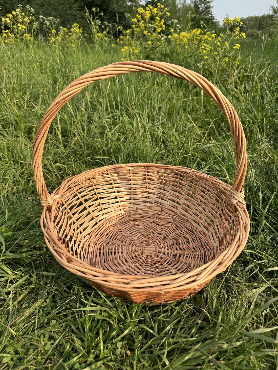 Коническое лукошко с диаметром дна 40 см получилось удобное, прочное и вместительное. На плоское донышко аккуратно складывается собранный урожай. Круглую ручку можно хоть целый день держать в ладони, не уставая.