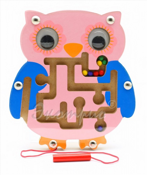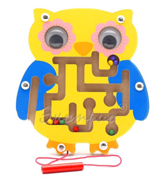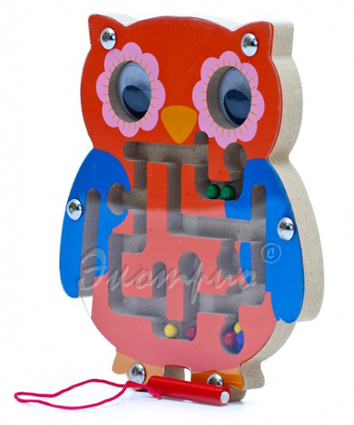 Очаровательная и, конечно же, очень полезная развивашка! Эта деревянная игрушка в форме симпатичного совенка представляет собой не что иное, как магнитный лабиринт. Намагниченные шарики катаются в хаотичном порядке по дорожкам лабиринта, а привязанная к корпусу лабиринта палочка имеет магнитный наконечник. С помощью этой «волшебной» магнитной палочки ребенок должен распределить разноцветные шарики по лабиринту, проведя их по нужной траектории. Такой магнитный лабиринт- прекрасный тренажер для мелкой моторики пальчиков, развития координации движений, ловкости, глазомера. Игрушка имеет достаточно компактный размер и небольшой вес, её удобно брать с собой в дорогу, да и заниматься дома очень комфортно.