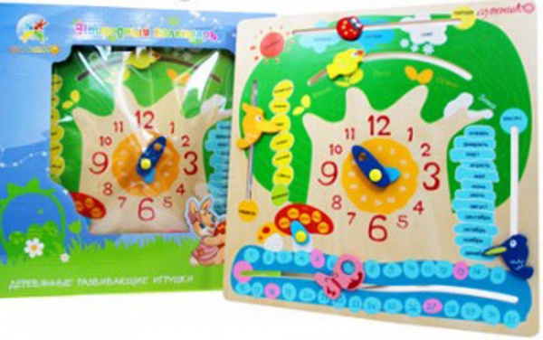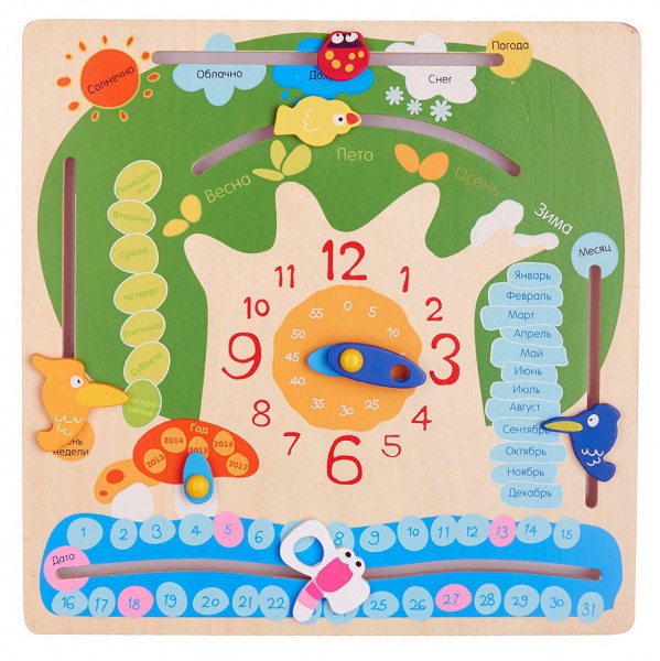 Яркий и очень полезный игровой предмет для обучения ребенка. Посредством такого вот календаря ребенок сможет научиться определять который час, разберется в последовательностях месяцев года и днях недели, а также постепенно запомнит, что в каждом месяце разное число дней. Если вы в доступной форме объясните малышу, как пользоваться этим календарем, то он каждое утро самостоятельно будет менять фишки, указывающие на день недели и число месяца! Научившись пользоваться календарем, ребенок будет сам напоминать, что именно сегодня тот день, когда Вы обещали сводить его в зоопарк или цирк!