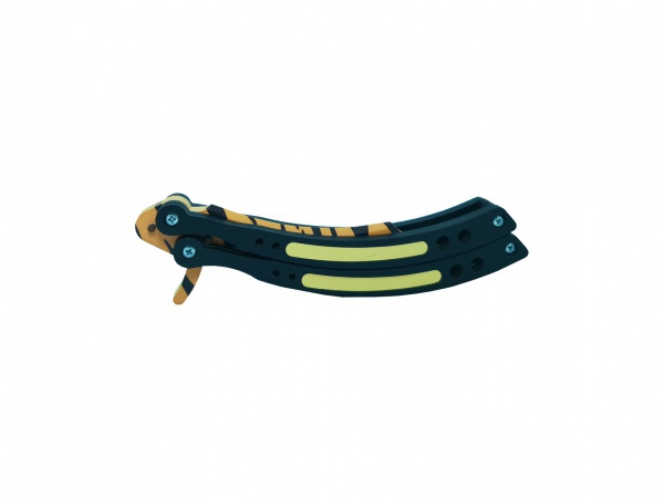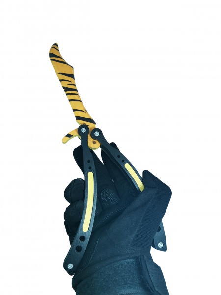 В сложенном виде клинок ножа складывается между двумя рукоятками. Нож балисонг кс го оснащен фиксатором, в точности, как оригинал. Этот вариант расцветки называется Зуб тигра. Он хоть и выглядит как настоящий, выполнен, полностью из дерева. Несмотря на точную детализацию, такой нож совершенно безопасен. Двойная рукоятка ножа удобна для самых разнообразных эффектных трюков.