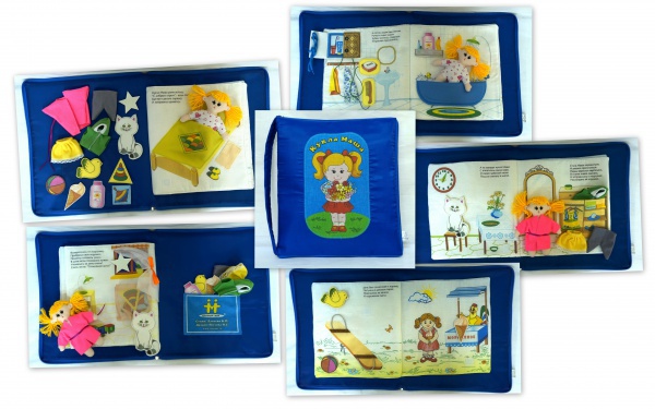Книжка содержит элементы для интересной игры. Это и сама Маша, и комплект ее одежды (халат, юбочка, штанишки, курточка), и кошка, которая у нее живет, и др.