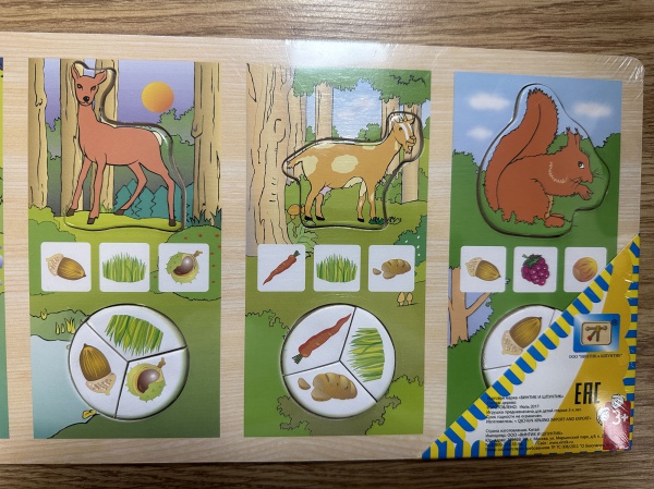Малыш должен сначала поместить зверей в нужные пазы, затем, руководствуясь картинками подобрать для каждого животного подходящие продукты питания.