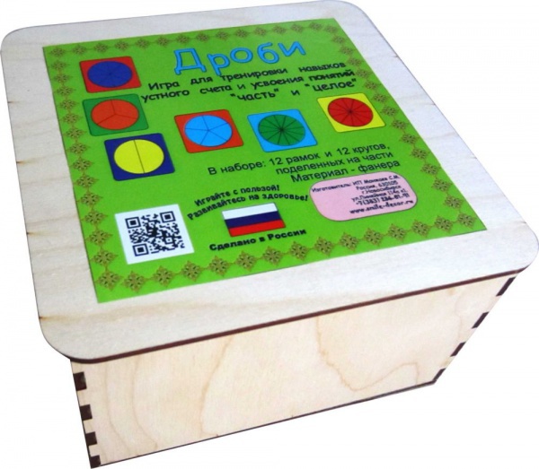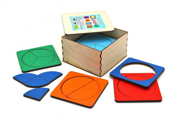 В наборе - 12 кругов, поделенных на части. Один круг - целый, остальные поделены на части: на две, на три, на четыре, на пять, на шесть и так до двенадцати. Отверстия в рамках - сквозные.
