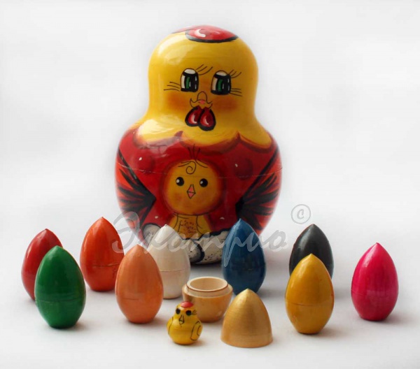 В набор водит : Шкатулка Курочка, внутри которой находятся 10 разноцветных яичек. В каждом яичке находится цыпленок.