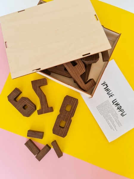 Цифры вырезаны из дерева и гладко отшлифованы. Они приятны в тактильном плане и пахнут натуральной древесиной. К игре приложена инструкция, которая объясняет, как использовать умные цифры с максимальной пользой. Всего игр 7, вы можете придумать и свои.