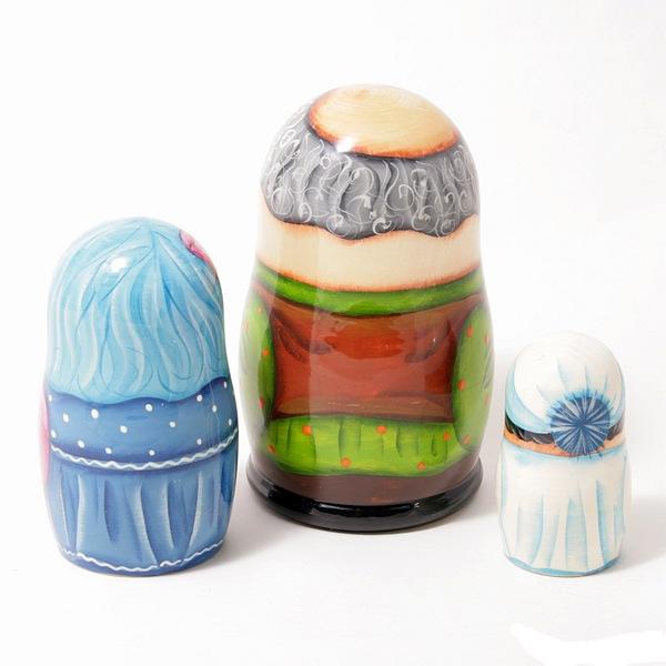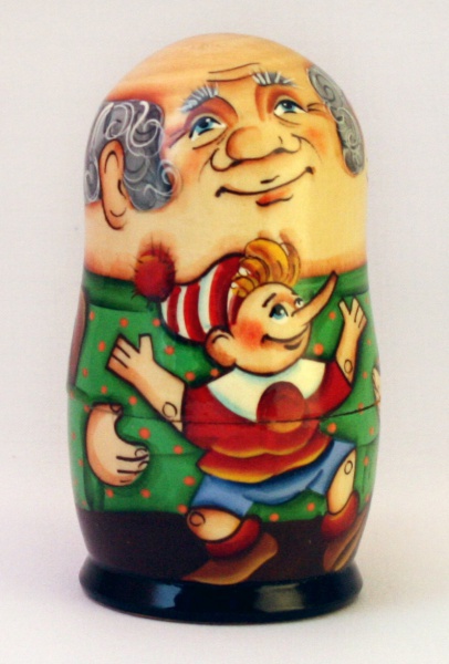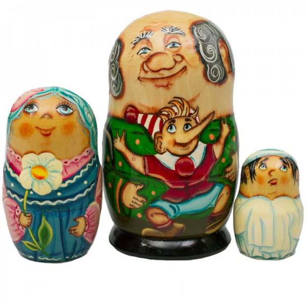 Матрешки работы мастеров из Переславля – настоящие произведения искусства. Они пользуются популярностью далеко за пределами города и даже нашей страны. Для изготовления матрешек используется качественное дерево элитных сортов. Профессиональные, опытные художники с особым вниманием подходят к росписи героев, максимально точно передавая их настроение и характер. Очередная коллекционная матрешка, созданная по мотивам знаменитой сказки «Золотой ключик». Главная фигура представлена в виде папы Карло, держащего в руках Буратино. Вторая фигура – красавица Мальвина с голубыми волосами. Наименьшей матрешкой коллекции является изображение грустного Пьеро. Все фигуры поражают своей реалистичностью и схожестью с персонажами известной сказки. Матреши ручной работы отличаются высоким качеством, устойчивостью красок и долговечностью.