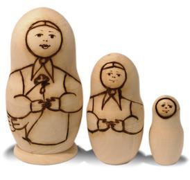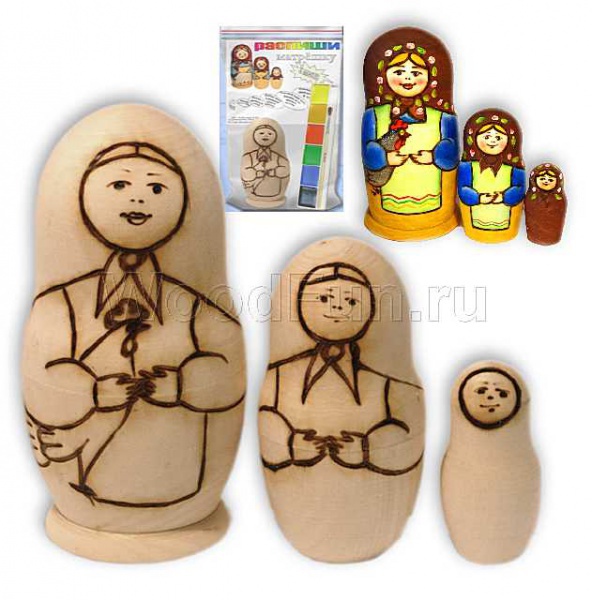 В набор входит 3 красавицы-матрёны (высота самой большой 11 см), а также акварельные краски. Кроме того, для закрепления нанесенного рисунка рекомендуется обработать матрешек лаком (не входит в набор).