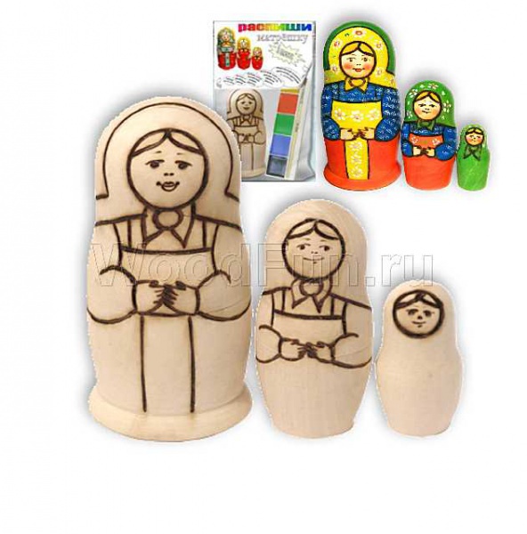Неокрашенные деревянные матрёшки (высота самой большой 11 см) расцветут вместе с вашими усилиями, а также акварельными красками (входят в набор).