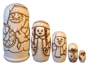 Вот, к примеру, набор «Распиши матрешку. Дет Мороз». В него входят 5 праздничных фигурок (высота самой большой – 15 см), среди которых и всем знакомый герой, и его внученька.