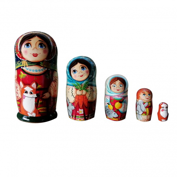 Пять голубоглазых красавиц в косынках хлопочут о друзьях наших меньших. В сюжетной линии: лисы, зайцы, ёжики — всё, что прибегает брататься из леса. В руках кормилиц и тепло, и яблочки, и морковка — хватит всем. Вторая по старшинству кукла даже наклонила голову, кокетничая с зайчонком.