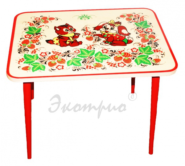 Детская мебель – это что-то необыкновенное, доброе и оригинальное. Вот, например, данный стол с холодной росписью. Он очень удобный, по размеру оптимально подходит для малышей. На нем симпатичный красочный рисунок, изображающий двух любимых героев мультфильмов – котенка и щеночка. Они выглядят весёлыми и дружелюбными, что всегда положительно сказывается на настроении крохи. Такое яркое изображение, выполненное с помощью технологии холодной росписи, невероятно способствует развитию малыша, его воображения и цветовосприятия.