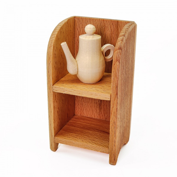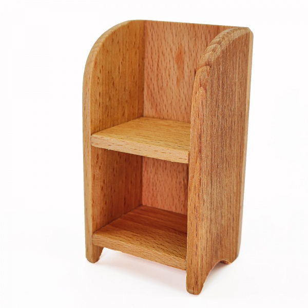 Гладкая этажерка серии Малышка — малюсенькая копия открытой тумбы на цельнокроеных ножках с двумя полками. Отдельные деревянные панельки соединены клеем. Прозрачное покрытие подчёркивает натуральный цвет и фактуру древесины. Верхние боковые углы скошены в полукруг. Русский стиль.