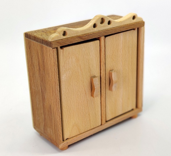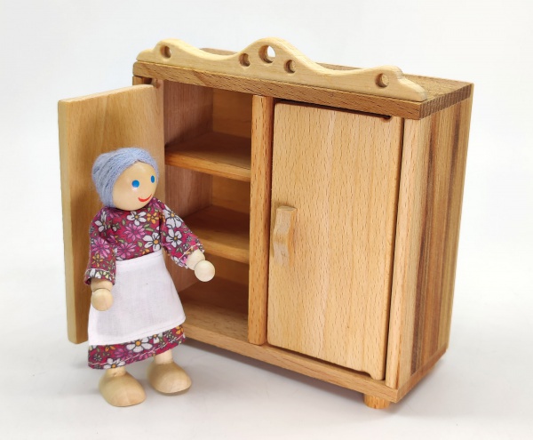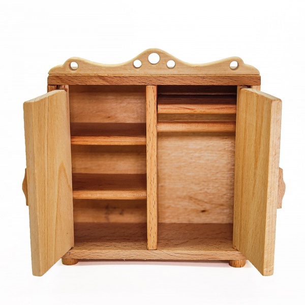 Шкаф двустворчатый игрушечный Малышка — увеличь масштаб и найди 10 отличий от настоящего! Дверки с накладными ручками и петельками распахиваются веером. Донышко поднято на ножки. Верхняя панелька украшена фигурным наличником. Две секции: с полочками и с перекладиной — всё не понарошку.